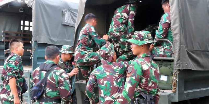 Pasukan satgas seterusnya melanjutkan perjalanan ke lokasi TMMD di kelurahan Teluk Meranti dengan menggunakan truk truk yang sudah di siapkan sebelumnya