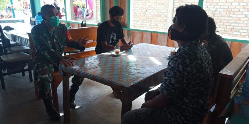 Dalam kesempatan itu Babinsa Serda Evi memberikan pemahaman himbauan tentang perlunya menerapkan protokol kesehatan Covid-19 baik di lingkungan tempat tinggal maupun di tempat umun dengan cara melaksanakan 3M (Memakai Masker, menjaga jarak dan mencuci tangan di tempat air yg mengalir).