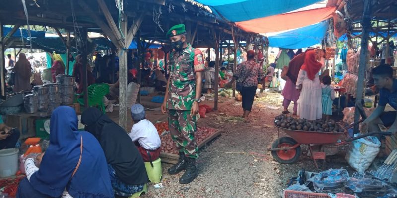 Babinsa himbau Pengunjung Pasar senin desa persiapan mahato Untuk Menggunakan Masker dan Mematuhi protokol kesehatan