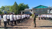 Bangkinang – Anggota Koramil 01/Bkn Kodim  0313/KPR Serma Dwi Krensa, bersama dua rekan Babinsa melaksanakan latihan peraturan baris berbaris (PBB) untuk siswa-siswi peserta Masa Pengenalan Lingkungan Sekolah (MPLS) di SMKN 1 Bangkinang, Kabupaten Kampar, Rabu (08/07/2025).