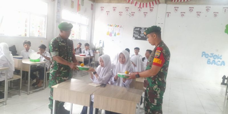 Dalam kegiatan tersebut, Babinsa bersama pihak sekolah dan tenaga kesehatan setempat membagikan makanan sehat berupa buah-buahan, susu, serta lauk pauk bergizi kepada para siswa. Kehadiran Babinsa tidak hanya sebagai bentuk dukungan, namun juga untuk memberikan motivasi kepada para siswa agar senantiasa menjaga pola makan sehat sejak dini.