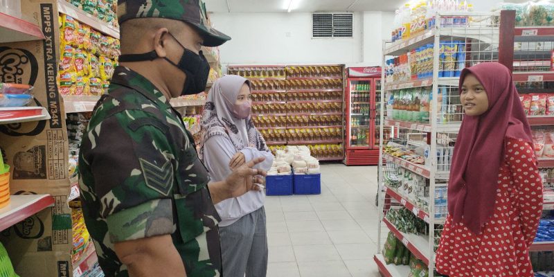 Pangkalan Kuras, Babinsa Koramil 04/Pkl Kuras Kodim 0313/Kpr Serka Yurnalis melaksanakan pemantauan terkait penerapan protokol kesehatan virus Corona (Covid-19) di Planet Swalayan Jalan lintas timur Kelurahan Sorek Satu, Kecamatan Pangkalan Kuras Kuras, Kabupaten Pelalawan,(Sabtu,29/10/2022).