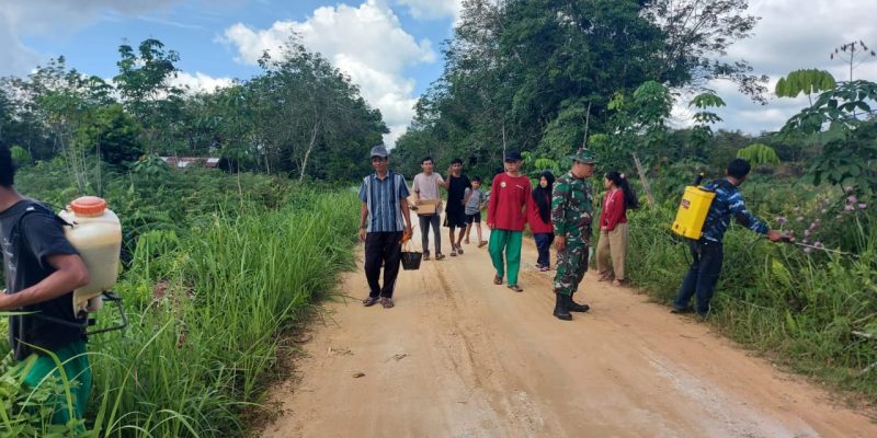 Babinsa bersama masyarakat binaan melaksanakan aksi gotong-royong untuk membersihkan sampah dan rumput liar yang menutupi jalan dan lingkungan.