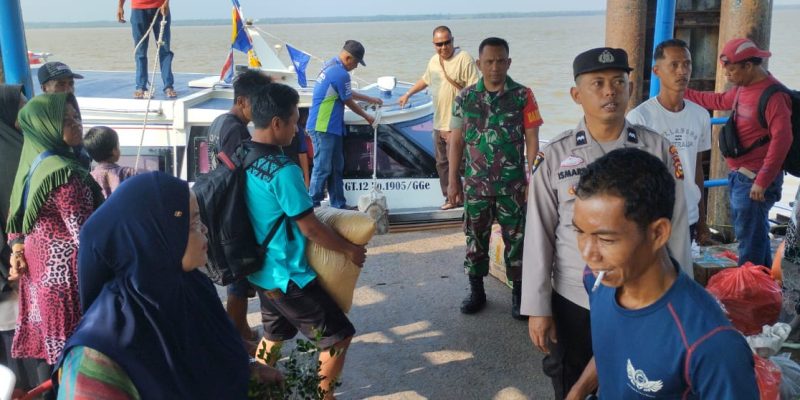 Pelalawan – Bersinergi Babinsa Koramil 15/Kuala Kampar, Kodim 0313/Kpr Serda Dedi wahyudi dan bhabinkantibmas Polsek Kuala kampar memantau langsung penumpang kapal yang akan berangkat ke Tanjung Batu dari Penyalai di pintu masuk pemantauan Pelabuhan Penyalai, di kelurahan Teluk dalam Kecamatan Kuala kampar, Kab Pelalawan, Jumat (25/08/2023).