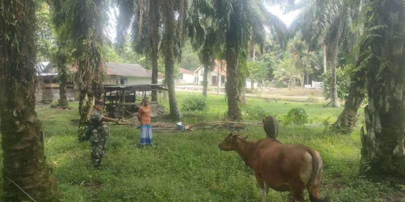 “Kita turun ke desa binaan serta melihat secara langsung hewan dan kita dapat memastikan kesehatan hewan ternak yang kemungkinan adanya ciri-ciri hewan tersebut terjangkit wabah Penyakit Mulut dan Kuku (PMK),” jelas Babinsa.