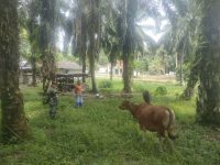 “Kita turun ke desa binaan serta melihat secara langsung hewan dan kita dapat memastikan kesehatan hewan ternak yang kemungkinan adanya ciri-ciri hewan tersebut terjangkit wabah Penyakit Mulut dan Kuku (PMK),” jelas Babinsa.