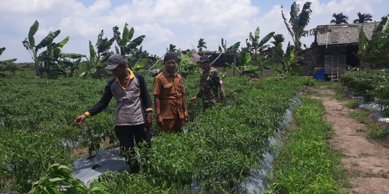 Dalam kegiatan tersebut, Babinsa bersama aparat desa melakukan pengecekan kondisi tanaman cabai yang mulai berbuah. Pendampingan diberikan untuk memastikan petani mendapatkan hasil panen yang optimal serta mampu menjaga stabilitas harga cabai di pasaran.