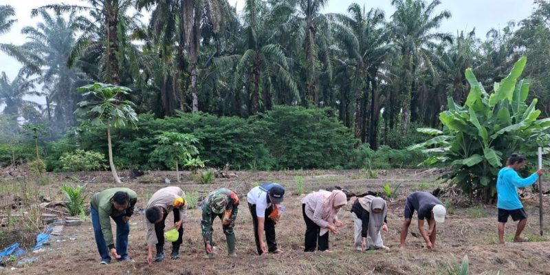 Tapung Hilir,- Sebagai langkah mendukung ketahanan pangan yang diprogramkan di desa binaan, Sertu Endi Suparto Babinsa Koramil 16/Tapung Kodim 0313/Kampar bersama Bhabinkamtibmas, perangkat desa dan pengurus BUMDes melaksanakan penanaman jagung pipil perdana di Desa Tebing Lestari Kecamatan Tapung Hilir Kabupaten Kampar. Selasa (16/12/2025).