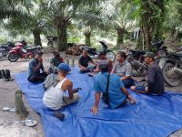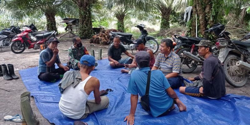 Kegiatan Komsos ini dilakukan di perkebunan sawit warga, dengan tujuan mengajak warga petani sawit untuk tetap mengutamakan keselamatan kerja dan menjaga agar tidak terjadi pencurian buah sawit di kebun mereka.