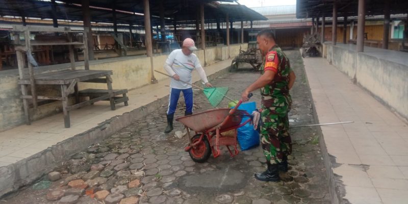 Kampar – Babinsa Koramil 07/Kampar Kodim 0313/Kpr Sertu Mulawarman gotong royong bersama pemuda membersihkan Pasar Tradisional Air Tiris, yang terletak di Kelurahan Air Tiris, Kecamatan Kampar, Kabupaten Kampar, Jumat (14/10/2022)