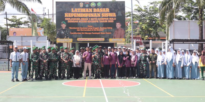 BANGKINANG – Kodim 0313/KPR menggelar upacara pembukaan Latihan Dasar Kepemimpinan Siswa (LDKS) SMA N 1 Koto Kampar Hulu pada Jumat, 24 Oktober 2025. Upacara yang berlangsung di Lapangan Upacara Makodim 0313/KPR ini, mengusung tema “Membentuk Generasi Yang Unggul Berdaya Saing Dan Bermartabat Di Era Modern: Transformasi Diri Menuju Masa Depan”.
