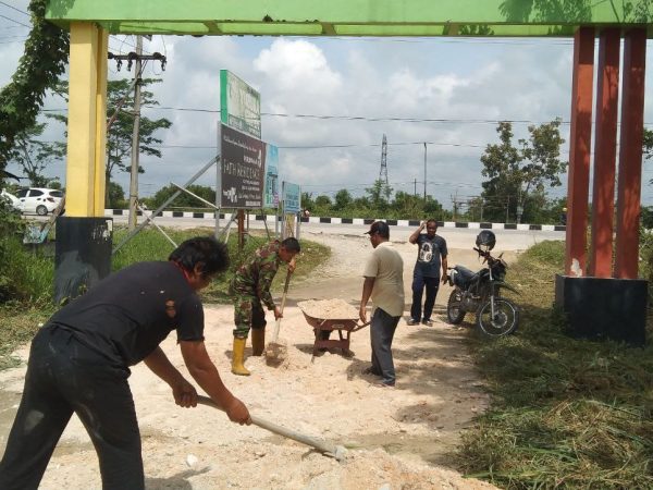 Babinsa Koramil 07/Kampar Bersama Warga Gotong Royong Timbun Jalan Rusak