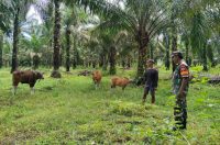 Babinsa Koramil 11/Tbs Kodim 0313/KPR Sertu Abinuh Daulay melaksanakan patroli sekaligus pemantauan dan pengecekan kesehatan hewan ternak milik warga sebagai antisipasi wabah penyakit mulut dan kuku (PMK).
