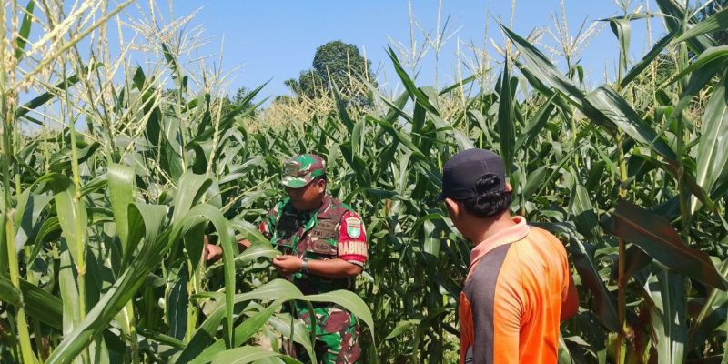 Babinsa melaksanakan penyisiran lahan milik petani, untuk memastikan pertumbuhan dan perkembangan tanaman jagung petani secara optimal di wilayah binaan.