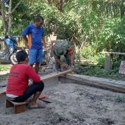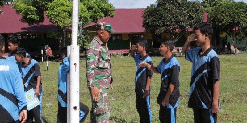 Teluk Meranti – Personel Satgas TMMD ke 115 Kodim 0313/KPR, Serda Supianto melatih siswa SMPN 01 Teluk Meranti menjadi Petugas Pengibar Bendera Merah putih pada upacara Senin yang akan diselenggarakan di Lapangan Sekolah SMPN 01 Kel Teluk Meranti Kec. Teluk Meranti Kab. Pelalawan Utara. Minggu 16/10/2022.