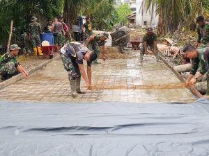 Selain TNI, Pengerjaan semenisasi jalan ini juga dibantu oleh warga sekitar. Terlihat kebersamaan dan keakraban para anggota TNI yang tergabung dalam anggota satgas TMMD bersama warga bergotong-royong.