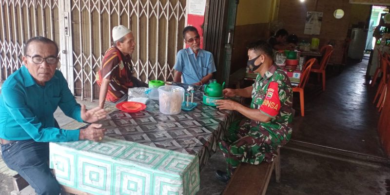 Kampar : Sertu Junaidi, Babinsa Koramil 05/KK Kodim 0313/Kpr melaksanakan kegiatan Komunikasi sosial kepada warga desa binaan di warung kopi Bpk Andika Desa Kuntu, Kecamatan Kampar Kiri, Kabupaten Kampar. Rabu ( 19/10/2022).