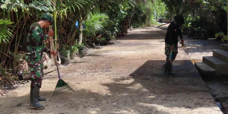 Anggota Satgas TMMD dan warga diterjunkan untuk mengambil dan mengumpulkan sisa – sisa matrial pengaspalan jalan, karena untuk membersihkan sisa material yang masih menumpuk di bahu jalan desa itu masih dipenuhi pasir, batu kerikil dan yang bisa membahayakan pengguna jalan.