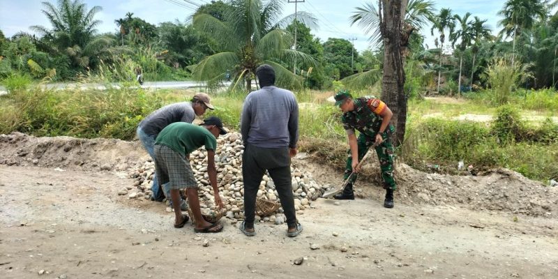 Rumbio Jaya – Babinsa Koramil 07/Kampar Kodim 0313/Kpr Serda Alexander melaksanakan Gotong royong penimbunan jalan yang berlubang bersama masyarakat binaan, Kegiatan yang dilaksanakan di desa Pulau Payung, Kecamatan Rumbio Jaya, Kabupaten Kampar. Jumat (7/10/2022)