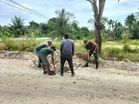 Rumbio Jaya – Babinsa Koramil 07/Kampar Kodim 0313/Kpr Serda Alexander melaksanakan Gotong royong penimbunan jalan yang berlubang bersama masyarakat binaan, Kegiatan yang dilaksanakan di desa Pulau Payung, Kecamatan Rumbio Jaya, Kabupaten Kampar. Jumat (7/10/2022)