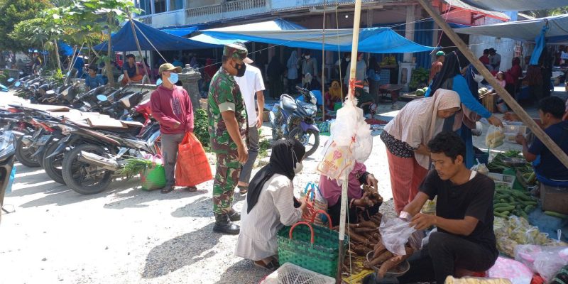 Dalam kesempatan tersebut Babinsa Serda Eriyal memberi himbauan kepada para warga yang berada di pasar agar selalu terapkan Protokol Kesehatan 4M yaitu dengan wajib masker saat aktifitas di luar rumah, mencuci tangan pakai sabun dengan air mengalir saat memasuki pasar dan keluar dari pasar, selalu menjaga jarak saat berbelanja, dan menghindari kerumunan.
