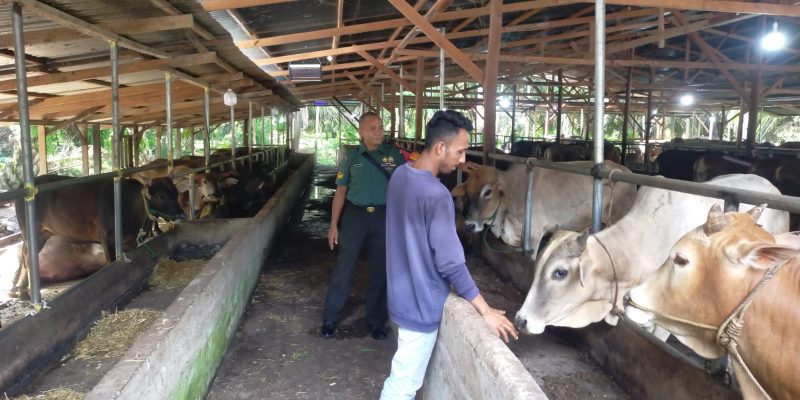 Bangkinang – Menjelang Hari Raya Idul Adha Babinsa Koramil 01/Bangkinang Hulu, Kodim 0313/ KPR, Sertu Sumarsono melaksanakan komunikasi sosial Bersama Bpk guntur pemilik Kandang penggemukan Sapi di Desa Laboy Jaya, Kec. Bangkinang, Kab. Kampar, Kamis,(05/06/2025).