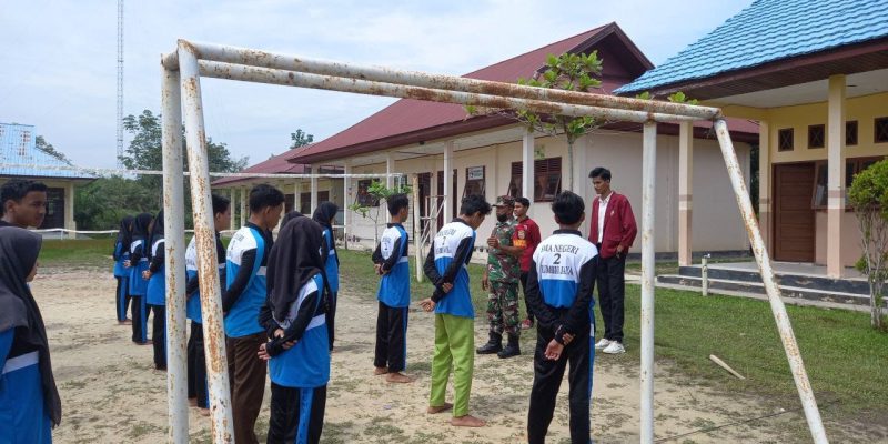 Rumbio Jaya – Babinsa Koramil 07/Kampar Kodim 0313/Kpr Sertu Azwir melaksanakan pembinaan bela negara diikuti oleh siswa SMA N 2 Rumbio Jaya Kampung Pancasila di Desa Bukit Kratai, Kecamatan Rumbio Jaya, Kabupaten Kampar. Senin (3/10/2022)