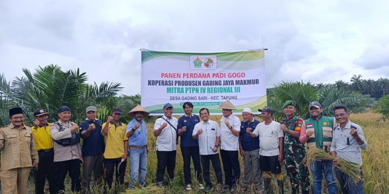 Tapung,- Memperkuat hubungan antara TNI dan masyarakat melalui kegiatan rutin, Pratu Dona Siagian Babinsa Koramil 16/Tapung Kodim 0313/Kampar melaksanakan kegiatan panen perdana padi gogo oleh kelompok tani Gading Jaya Makmur di Desa Gading Sari Kecamatan Tapung Kabupaten Kampar. Selasa (30/12/2025).