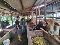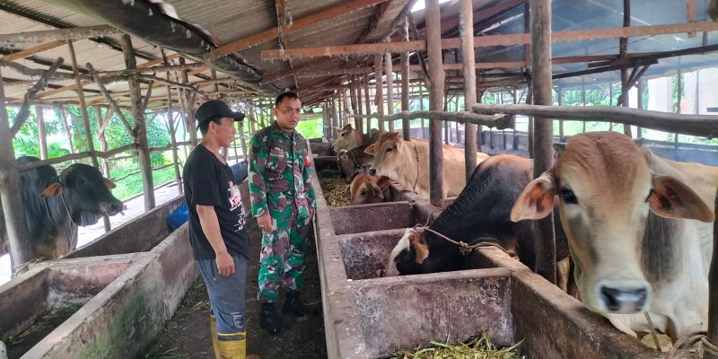 Dalam kegiatan tersebut, Babinsa berdialog langsung dengan peternak, memantau kondisi fisik hewan ternak, serta memberikan imbauan terkait pencegahan penyebaran PMK.